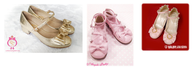 Sapatos: sapatos lolita tendem a ser delicados. Comumente tem bico arredondado e salto quadrado, além de alguns possuírem detalhes de pérolas e laços.